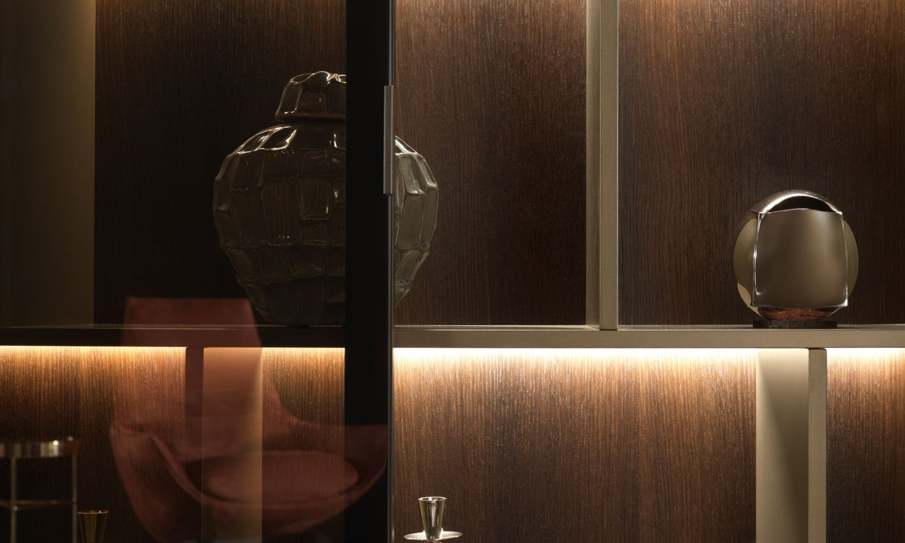 Crossing TV Ünitesi, yüksek tavanlı ve aydınlık mekânlar için tasarlanmış, mimari bir tasarım stiline sahiptir. Ünitenin tavan hizasına kadar uzanan üst panelleri, mat bej/krem deri görünümlü malzeme ile kaplanmış olup, mekana sıcak ve sofistike bir doku katar. Bu üst panellerin altındaki koyu füme ahşap ve aynalı sergileme nişleri, ünitenin ana görsel zenginliğini oluşturarak, entegre LED aydınlatmalarla dekoratif objeleri ve koleksiyonları dramatik bir şekilde vurgular.