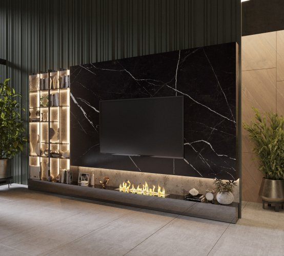 Ilda TV Ünitesi, mermer kaplama ve entegre şömine detayıyla ultra lüks ve dramatik bir tasarım stiline sahiptir. Ünitenin dominant özelliği, merkezi TV alanını tamamen kaplayan, çarpıcı beyaz damarlı siyah mermer görünümlü büyük paneldir. Bu güçlü malzeme kullanımı, üniteye anında bir prestij katarken, geri plandaki dikey yivli (fluted) koyu duvar kaplamasıyla derinlikli bir kontrast oluşturur.